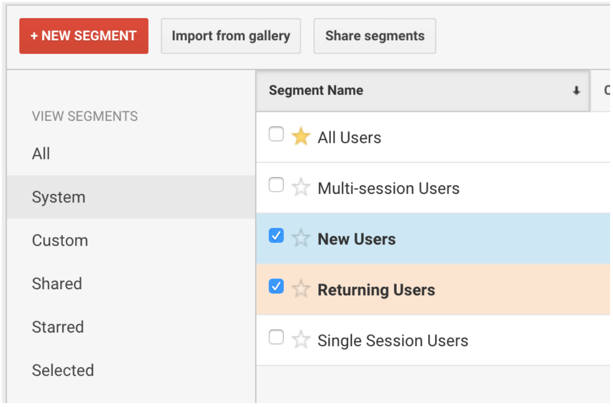 We can also use segments to better understand our new vs. returning users. Luckily, Google knows this is an important audience and pre-loads our Google Analytics accounts with these segments already created in the System tab. We can therefore quickly find — and easily apply — these valuable segments.