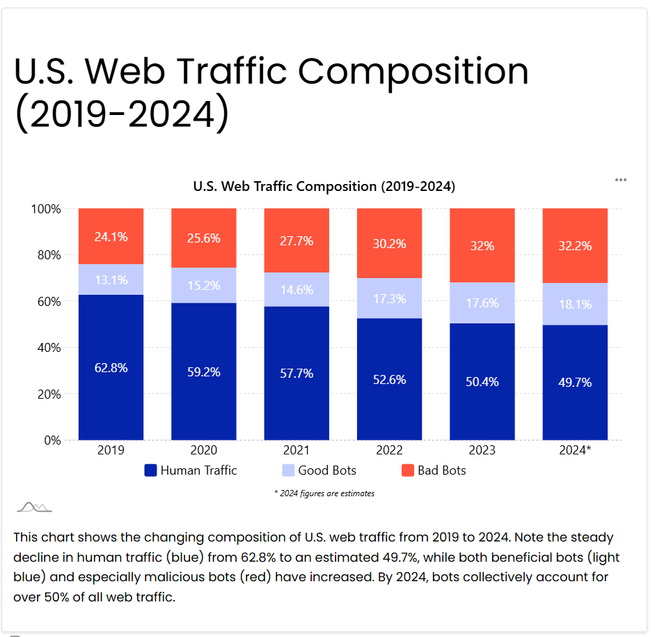 For the first time, bots now outnumber humans online. Human traffic dropped from 62.8% in 2019 to below 50% in 2024. Meanwhile, bots—both helpful and harmful—now dominate web traffic, marking a fundamental shift in digital strategy.