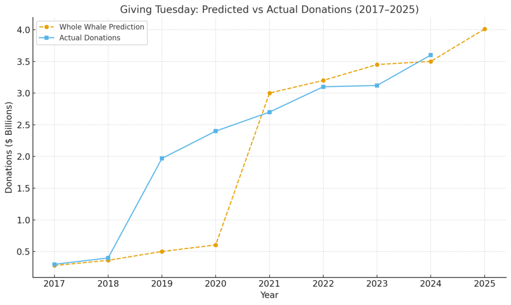 Based on our analysis that incorporates an adjusted linear regression, trends in Google Search terms around “Giving Tuesday,” and national giving trends, Whole Whale predicts that $4.01 Billion will be raised on Giving Tuesday December 2nd, 2025. This will be a 11% or ~$410 million increase over 2024’s record-breaking $3.6B.