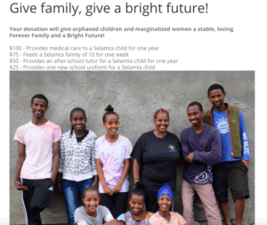 For donations, tie dollar amounts to services or impact, and make donating in a person’s name the gift of the year. The Selamta Family Project breaks down each monthly giving amount so your donation feels tangible. Giving Mom the feels that come with giving a student free medical care for a year? Talk about the gift that keeps on giving.